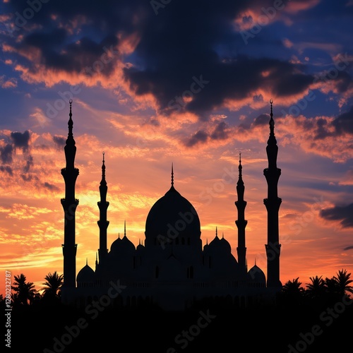 Majestic Mosque Silhouette with Glowing Sunset Sky