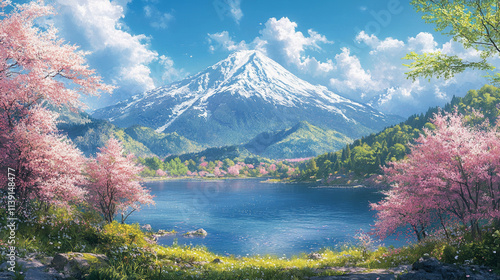 Majestic Mount Fuji rises above a tranquil lake, framed by vibrant cherry blossoms and lush trees. The serene setting symbolizes harmony, renewal, and the enduring beauty of nature