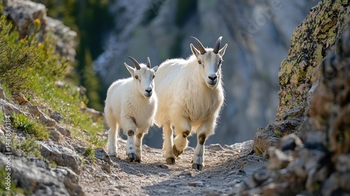 Majestic mountain goats gracefully traverse a rocky trail with effortless ease