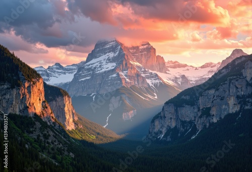 Majestic mountain landscape at sunset with dramatic clouds and valleys