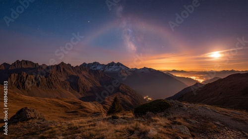 mountain, landscape, starry, sky, lactic, way, moonrise, dusk, alpine, wilderness, scenic, nature, travel, view, horizon, twilight, evening, calmness, beauty, exploration, adventure, peaceful, illumination, highland, terrain, atmospheric, natural, distant, peak, photo, night, calm, serenity, cloud, weather, star, panorama, light, solitude, environment, geology, summit, scenery