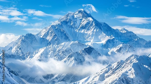 majestic, mountain, peak, cover, snow, clear, blue, sky, view, landscape, scenic, glacier, nature, alpine, cliff, snowcap, surround, beauty, vale, winter, challenge, tranquil, summit, ascent, mont, serene