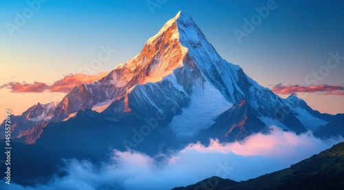 Majestic mountain peak, snow-capped and vibrant with hues of sunset, rises above clouds
