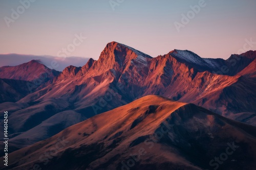 mountain, sunset, landscape, nature, peak, orange, red, glow, light, gold, hours, dusk, evening, scenic, majestic, breathtaking, range, altitude, summit, outdoors, wilderness, travel, adventure, scenery, beauty, sky, cloud, snow, rock, geology, panorama, inspiring, vibrant