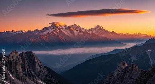 Majestic Mountain Range at Sunset A Stunning View of Peaks and Golden Light