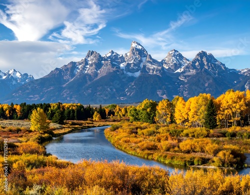 Majestic mountain range overlooking golden trees and a flowing river