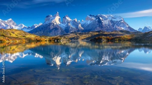 Majestic mountain range reflecting in a crystal-clear lake