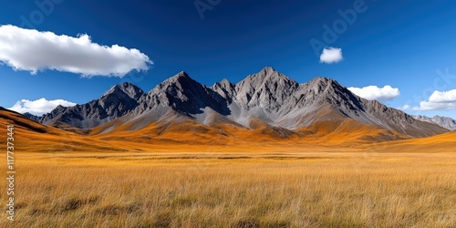 Majestic Mountain Range Under Bright Blue Sky with Fluffy Clouds and Golden Grassland Landscape
