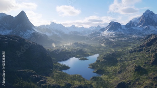 Majestic Mountain Range with a Tranquil Lake and Green Valley Vista