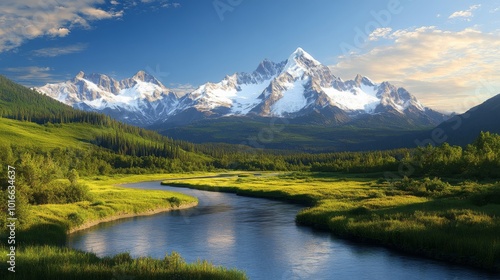 nature, travel, peak, stream, sunny, awe, calm, grass, majestic, green, range, tranquil, water, forest, inspiring, capped, meadow, river, day