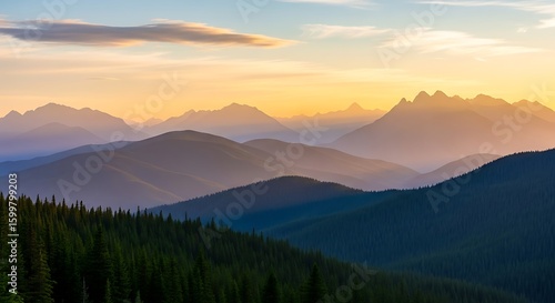 mountain, mountain chain, sunset, golden hour, landscape, scenic, nature, outdoors, wilderness, serene, peaceful, tranquil, hazy, misty, layered, silhouette, evening, dusk, twilight, sky, horizon, alpine, forested, evergreen, tree, peak, ridge, vale, natural beauty, breathtaking, majestic, vista, panoramic, background, photo, travel, adventure, exploration, remote, untouched, earth, geology, atmosphere