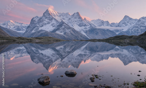 mountain, lake, dawn, serene, landscape, snow-capped, alpine, tranquil, nature, scenery, majestic, calm, water, sky, pink, purple, symmetry, picturesque, natural, beauty, wilderness, travel, adventure, peaceful, morning, horizon, rock, grass, texture, depth, environment, photo, scenic, vista, highland, untouched, pristine, remote, get-away, escape, exploration, hiking, trekking, cold, winter, frost, peak