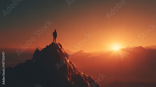 man, standing, mountain, sunset, dusk, nature, landscape, outdoors, adventure, hiking, triumph, achievement, success, conquering, majestic, peak, summit, silhouette, sky, cloud, orange, yellow, red, sunlight, twilight, horizon, scenic, beauty, awe, contemplation, meditation, peaceful, serene, tranquil, inspirational, motivation, discovery, exploration, journey, solitude