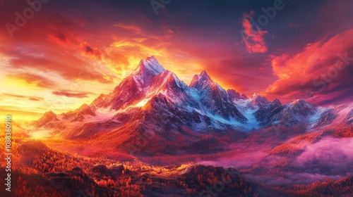 Majestic mountain vista with vibrant autumn colors bathed in golden sunset light, showcasing dramatic skies and serene beauty, perfect for nature enthusiasts and decor lovers