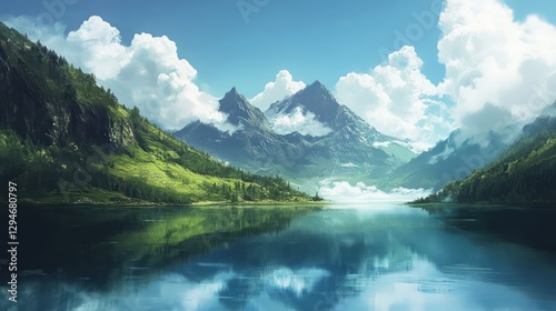 Majestic mountains covered in lush green forests rise sharply from the edge of a crystal-clear lake, with large