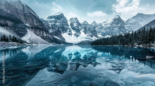 Majestic mountains reflect in serene, icy lake surrounded by evergreen trees