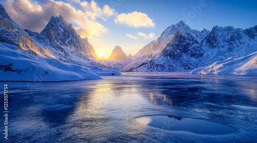 mountain, lake, sunrise, winter, snow, landscape, calmness, nature, beauty, icy, serene, remote, peak, cold, scenic, sunlight, blue, cloud, wilderness, atmosphere, calm, environment, travel, view, adventure, exploration, majestic, peaceful, weather, morning, picturesque, horizon, natural, glacé, breathtaking, pristine, clear, sky, wildlife, outdoors, ice, water, bright, sunny, geology