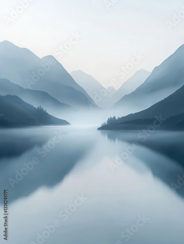 mountain, lake, water, fog, landscape, nature, tree, sky, blue, calm, peaceful, serene, vale, mist, scenic, horizon, outdoors, tranquil, environment, depth, layer, distant, ridge, peak, silhouette, coastline, surface, stillness, view, vista, aethereal, gradient, soft, subtile, light, atmosphere, vapour, shoreline, pristine, wilderness, remote, untouched, elevation, natural, beauty, symmetry, picturesque