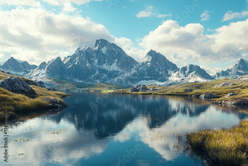 mountain, lake, cloud, serenity, landscape, nature, greenery, outdoors, scenery, peaceful, vibrant, blue, sky, hiking, adventure, exploration, wildlife, calmness, relaxation, summer, travel, picturesque, scenic, water, alps, wilderness, camping, spot, sunlit, breathtaking, calm, fresh, air, natural, beauty, geology, environment, vista, tour tourism