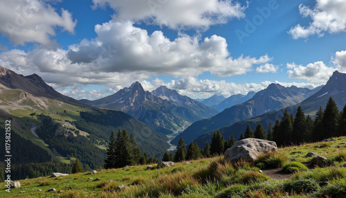 mountain, sky, cloud, landscape, nature, scenery, high altitude, wilderness, green, tree, rocky, sunlight, blue, tranquil, panoramic, altitude, hiking, exploration, adventure, summer, daytime, natural, scenic view, peak, foliage, vale, fresh air, travel, tour tourism, beautiful, rugged, open space, ecotourism, environment, breathtaking, serene, peaceful, huge, bright, hill, mountain chain, freedom, untouched, natural beauty, majestic