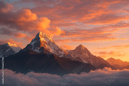 Majestic Mountainscape at Dawn: The imposing peaks of mountains pierce through the swirling clouds as the golden light of sunrise bathes the rugged landscape in an ethereal glow.