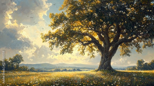 Majestic oak tree in serene landscape at sunset nature photography tranquil environment wide angle view