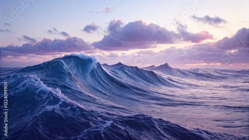 Majestic ocean waves rise under colorful sunset sky, creating serene atmosphere