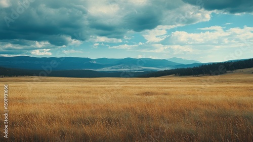 Majestic Open Field Under Dramatic Sky in Mountainous Landscape