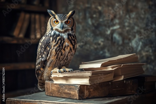 owl, book, old, majestic, bird, wise, perched, stack, antique, library, cognition, wisdom, feather, talon, eye, orange, brown, dark, background, wooden, table, vintage, literature, reading, learning, study, nocturnal, predator, hunter, beautiful, nature, wildlife, animal, creature, mysterious, secret, ancient, history, story, page, text, mythical, guardian, serene, powerful, regal