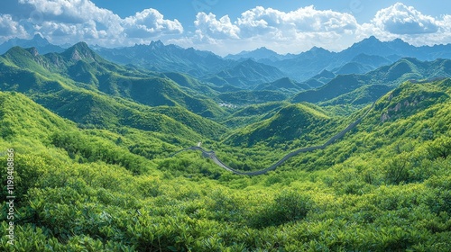 mountain, wall, great, china, green, landscape, nature, scenic, view, panorama, travel, asia, history, ancient, architecture, summer, day, sky, cloud, hill, vegetation, tree, foliage, path, winding, road, distant, range, peak, blue, bright, destination, explore, wonder, heritage, culture, historical building, serene, peaceful