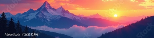 Majestic peaks ablaze, sunset paints misty pines , sunset, woods, glow