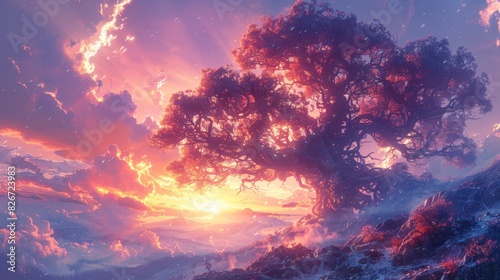 pine, tree, antler, view, majestic, intricate, nature, wildlife, sculpture, sunset, vibrant, colours, surreal, fantasy, artistic, creative, forest, timberland, outdoors, detailed, animal, cervid, imaginative, beauty, landscape, scene, wilderness, natural, art