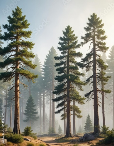 Majestic pine trees in a watercolor painting style, serene, landscape, art, nature, pine trees