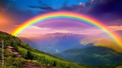 Majestic Rainbow Arching Over Lush Green Mountains at Sunset