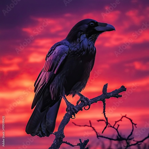raven, crow, bird, sunset, tree branch, tree, sky, cloud, red, pink, purple, silhouette, majestic, perched, nature, wildlife, animal, feather, beak, talon, claw, wing, darkness, light, shadow, evening, twilight, colours, vibrant, beautiful, scene, landscape, outdoors, image, photo, artwork, art, graphic, digital, design