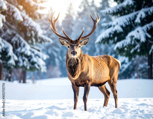 Majestic red deer standing proudly in a snowy winter wonderland forest landscape