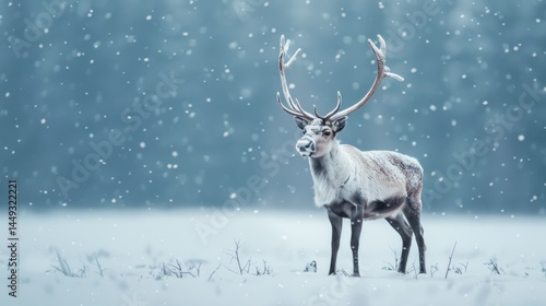 Majestic reindeer standing in snow du winter snowfall with large antlers and thick fur amidst a cold snowy landscape under overcast sky