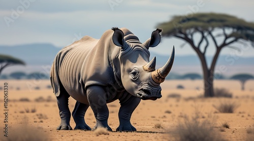 Majestic rhinoceros standing tall in the African savannah, showcasing its powerful horn against a backdrop of acacia trees and open plains, symbolizing wildlife conservation and natural beauty in Afr