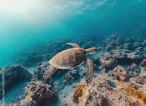 Majestic Sea Turtle Swimming Gracefully Through Clear Blue Ocean Waters Over Coral Reef Landscape