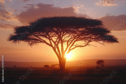 Majestic silhouette of an acacia tree at sunset, casting shadows over a serene savanna landscape