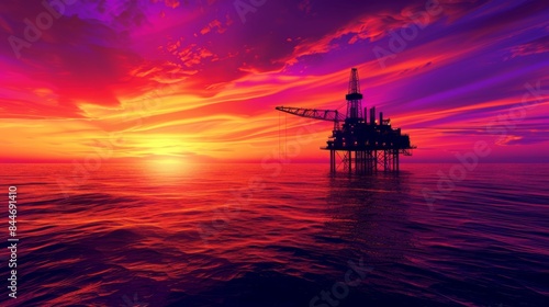 silhouette, crude oil, platform, vibrant, sunset, orange, purple, ocean, drilling, production, energy, sector, bright, colours, oil, rig, offshore, industry, industrial, dramatic, sky, dusk, exploration, facility, site, engineering, natural, resource, fuel, extraction, environmental, impact, technology, infrastructure