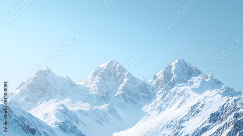 Majestic snow capped mountains rise against clear blue sky, evoking sense of tranquility and awe.
