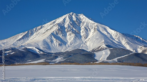 Majestic snow-capped mountain peak under a vibrant blue sky, serene winter landscape