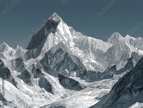 mountain, snow, peak, majestic, range, landscape, nature, winter, summit, high, altitude, adventure, exploration, travel, scenic, beauty, grandeur, serene, wilderness, alpine, ice, rock, geology, contour, line, drawing, artistic, stylised, graphic, modern, abstract, dramatic, epic, view, vista, remote, cold, climate, environment, earth, terrain, topography, sublime