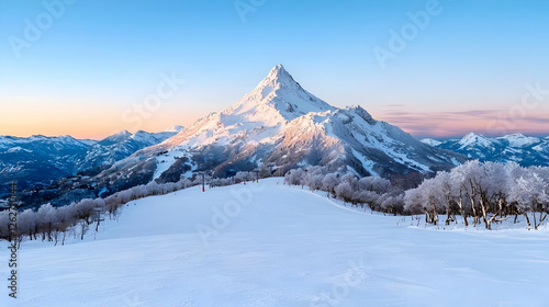 Majestic snow-capped mountain sunrise, ski resort background, winter landscape, travel poster