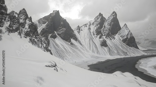 mountain, snow, ocean, landscape, nature, scenic, peak, cloud, winter, wilderness, scenic view, coastline, rock, environment, adventure, travel, photo, cold, glacier, serene, tranquil, dramatic, remote, ice