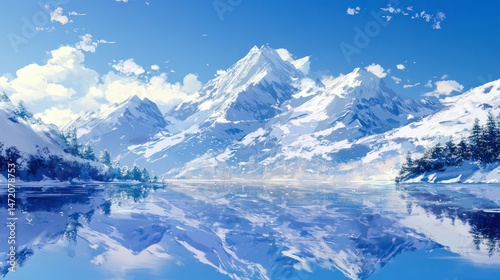 Majestic snow-capped mountains reflecting in a serene lake under a clear blue sky