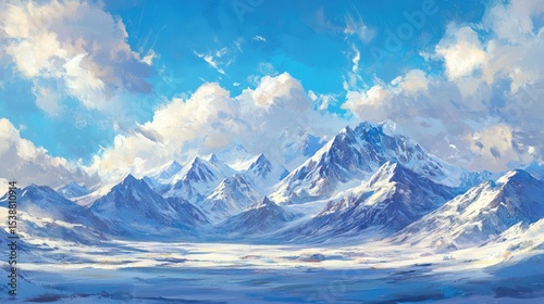 Majestic Snow-Capped Mountains Under a Clear Blue Sky with Dramatic Clouds in a Serene Alpine Landscape