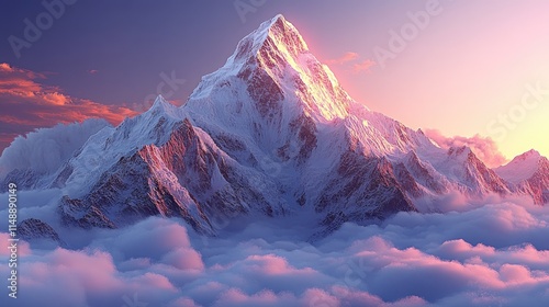 Majestic snow-covered mountain peak rises above a sea of colorful clouds at sunset, showcasing nature's breathtaking beauty.
