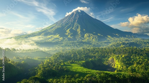 Majestic Southeast Asian volcano with a lush green base, towering over the landscape